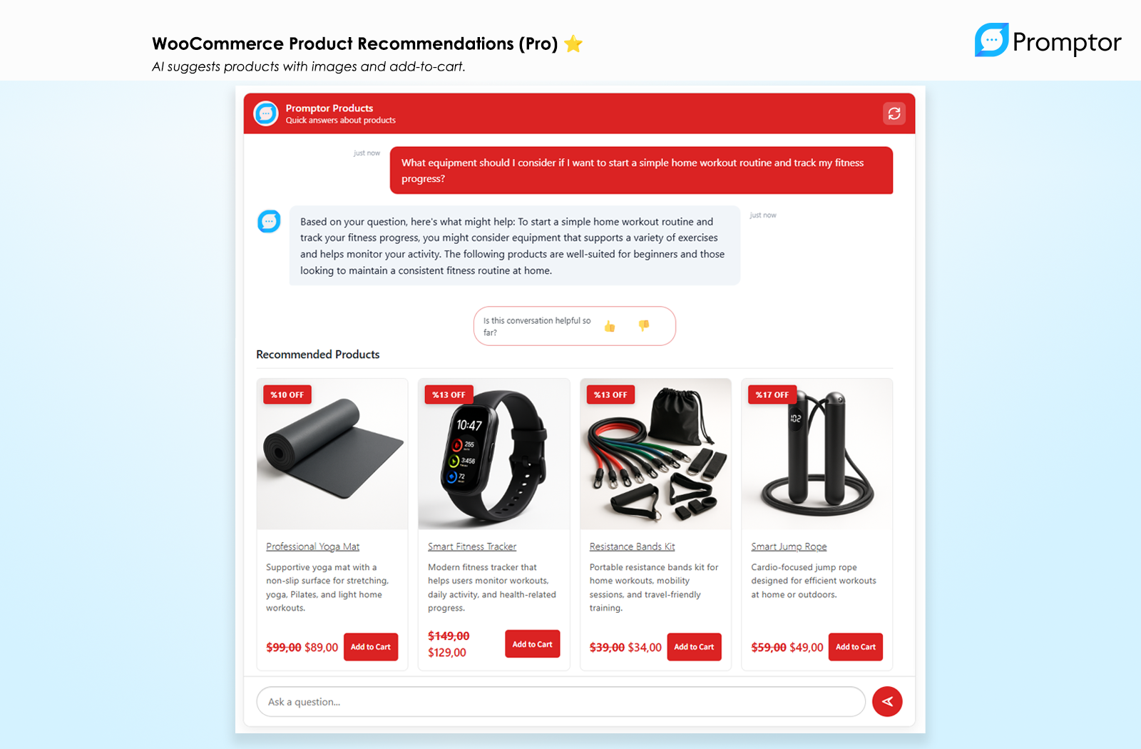 Upgrade to Promptor Pro to unlock unlimited knowledge bases, WooCommerce product recommendations, analytics dashboards, and automation tools. Learn more